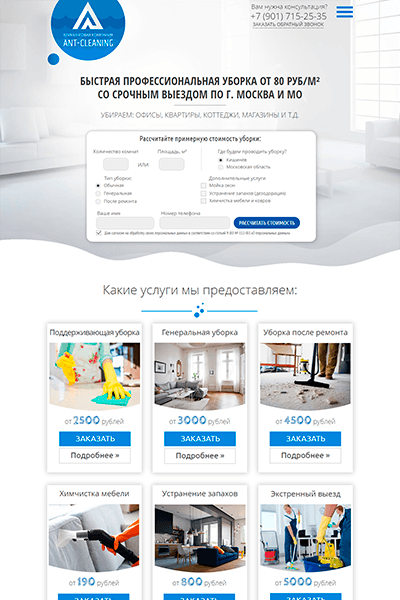 Многостраничный сайт в формате Landing Page для ANT-CLEANING